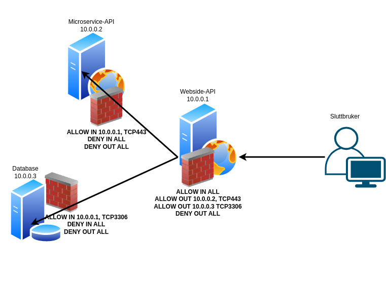 To enforce a zero-trust architecture, all components must be isolated and only made available to the services that they themselves will consume or deliver data to. This makes it necessary to have a firewall between components in the same application, between applications, and between the application and the Internet. If you have an application with a database, a backend API, and a web API, it is advantageous if you can set firewall rules between the components that only allow the necessary traffic. See the diagram below for an example.