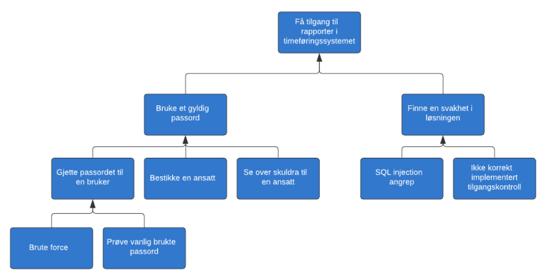 In this example, the main goal of an attacker is to access reports in a time tracking system. To achieve the main goal, the attacker can either use a valid password in the system or find a vulnerability in the solution that grants access. One way to obtain a valid password is to bribe an employee. This way, you add different ways to reach the main goal and subgoals. You then go through the identified threats and verify that countermeasures are in place or decide to accept that there are threats to the system that you will not protect against. The cost of countermeasures should always be weighed against the value of what is being protected.