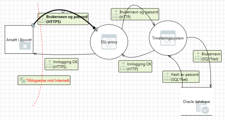 In the data flow diagram above, you can see that there is a risk that someone with access to the network between the SSL proxy and the time tracking system can read and modify the username and password that are not encrypted over HTTP. By going through all data flows while thinking about possible attacks according to the STRIDE model, you can build a list of potential threats to the system.